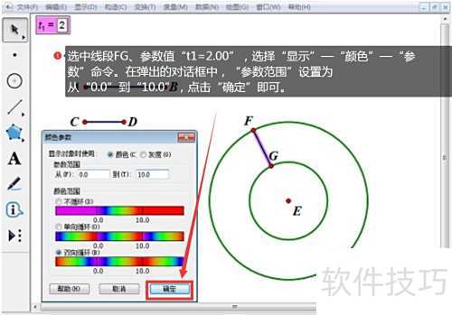 5、 选中线段FG和参数t1=2.00,执行显示菜单下的颜色→参数命令。在对话框中将参数范围设为0.0至10.0,确认后完成设置。