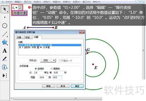6、 选定点F和参数t1=2.00,依次点击编辑菜单中的操作类按钮并选择动画。在弹出窗口中设置数值:单位为1.0,时间为0.05秒,范围从-10.0到10.0,运动方式设定为点F沿圆#1逆时针方向以中等速度运动。
