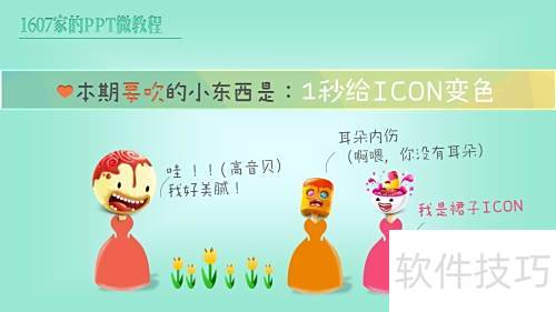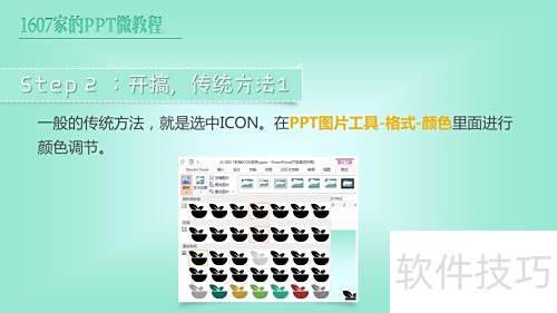 3、 通常做法是选中图标,通过PPT图片工具中格式选项下的颜色功能进行调整。