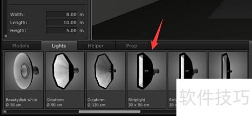 4、 接下来将介绍如何在3D Studio中添加摄影灯,只需点击软件左下角的Lights选项,即可浏览并选择多种类型的灯光进行设置,轻松实现理想照明效果。