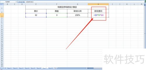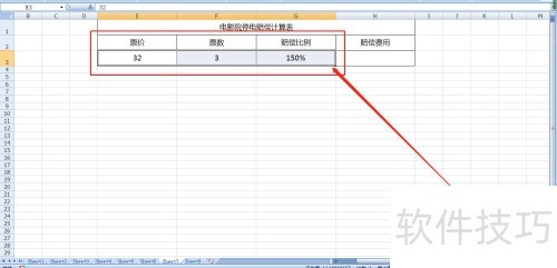 5、 第三步,在赔偿费用单元格中输入公式=E3*F3*G3,即票价乘以票数再乘以赔偿比例,计算出应赔金额。