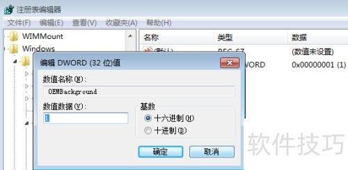 6、 右键点击右侧OEMBackground进行修改,在弹出窗口中将基数设为十六进制,数值数据填入1,确认保存,操作所示。