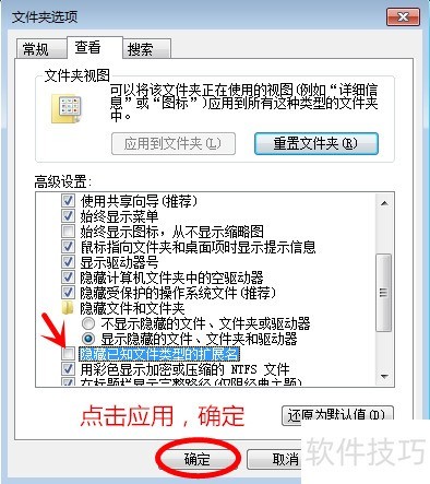 2、 打开文件夹选项,切换至查看标签,取消勾选隐藏已知文件类型的扩展名,点击应用并确认,最后关闭窗口,操作所示。