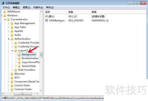 5、 打开注册表编辑器后,依次展开以下路径:HKEY_LOCAL_MACHINE、SOFTWARE、Microsoft、Windows、CurrentVersion、Authentication、LogonUI,最后进入Background项,具体结构中所示。操作时请按层级逐级进入,确保准确找到目标位置,避免误改其他注册表项,修改前建议备份注册表以防出现系统异常情况。