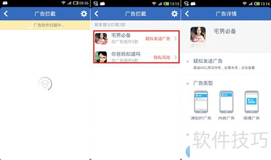 3、 进入广告拦截页面,扫描手机内所有含广告的应用并列出清单。