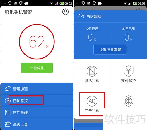 2、 腾讯手机管家:防护监控中开启广告拦截功能