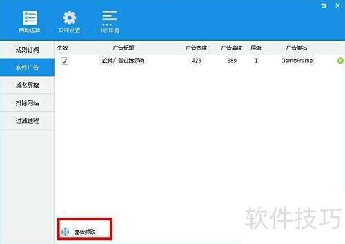3、 点击下方软件广告选项,可选择拦截广告。左下角有窗体抓取功能,启动软件后若出现广告,点击此处抓取,即可自动导入规则。
