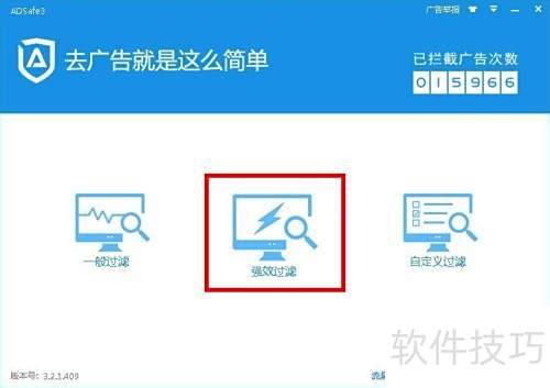 1、 安装adsafe3广告管家后,点击图示的强效过滤按钮,即可进入强效过滤功能。