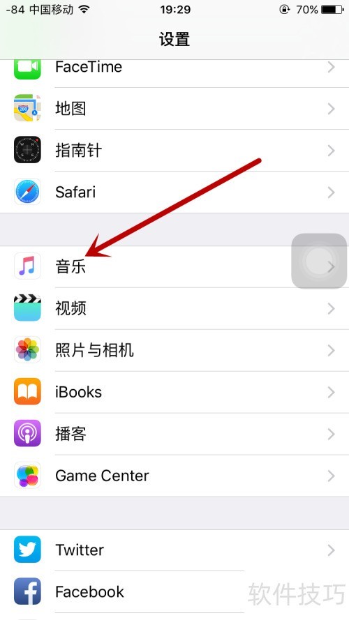 4、 点击设置,下滑页面,找到并进入音乐选项。