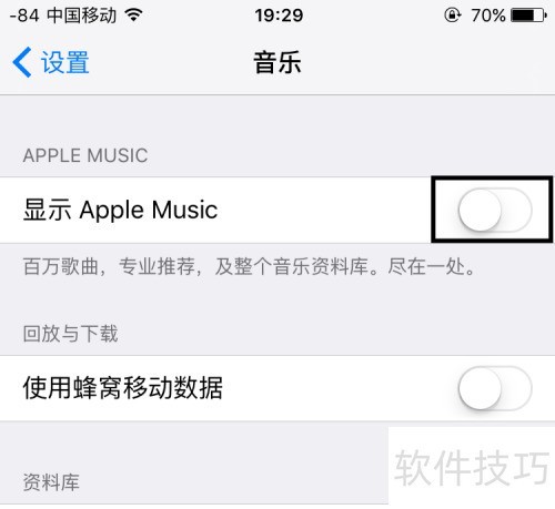 5、 进入音乐界面后,首项显示Apple Music,按钮呈绿色,处于开启状态。