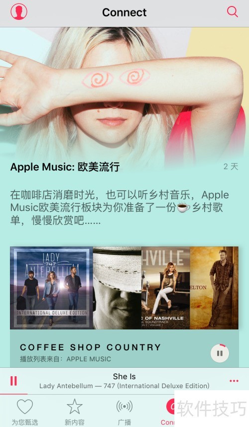 3、 播放音乐后,下方菜单栏会显示五个标签:为您甄选、新内容、广播、Connect 和我的音乐。其中,iPad 版本额外多出一个播放列表标签,而 iPhone 因界面限制未直接显示,但仍具备该功能。