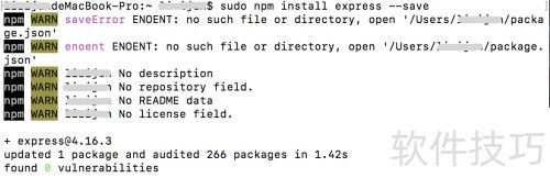 1、 在终端中输入并运行命令:sudo npm install express --save,以下载并安装Express框架。