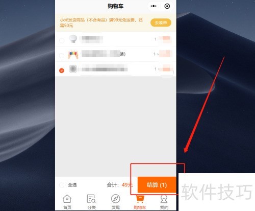 2、 在购物车中选择需购买的商品,点击结算按钮,进入结算页面,操作所示。