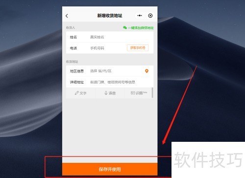 5、 第五步,在新增地址页面按提示填写信息,确认无误后点击保存并使用完成操作。