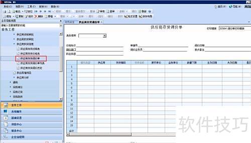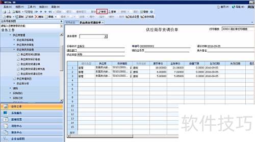 6、 进入业务工作模块,依次选择供应链、采购管理、供应商管理,进入供应商供货信息,打开供应商存货调价单。双击调价单后,点击工具栏定位,输入查询条件查找待审核单据,确认无误后执行审核操作。