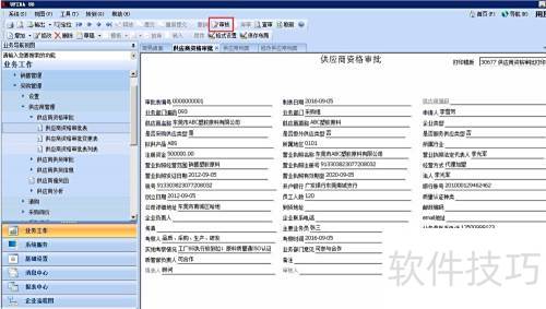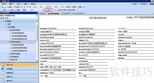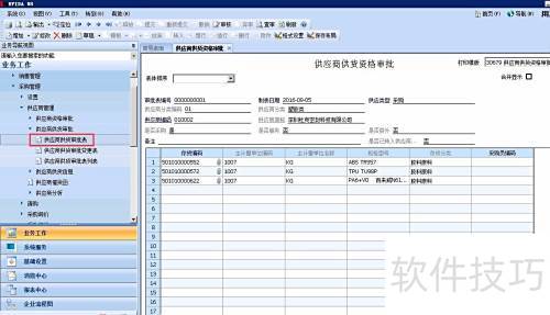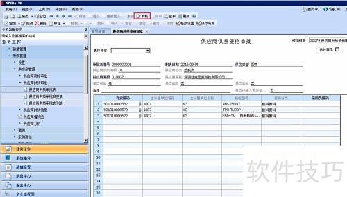 2、 采购员完成供应商资格审批信息录入后,需由采购负责人或公司副总进行审核。审核内容主要包括供应商的营业执照所列经营范围、法人信息、注册资金等工商资料,以及各部门实地考察结果和相关意见。操作路径为:进入业务工作模块,依次选择供应链、采购管理、供应商管理,点击供应商资格审批,打开审批表,双击对应供应商信息进行审核操作。