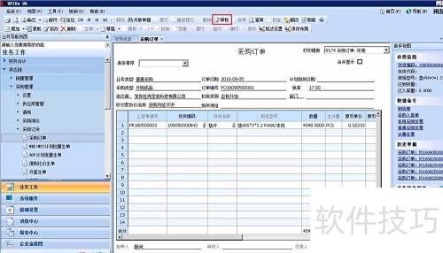 8、 进入业务工作模块,选择供应链下的采购管理,进入采购订货中的采购订单界面。双击打开采购订单,点击工具栏的定位功能,在查询条件中输入订单号或供应商名称,查找出对应订单后,进行审核操作。