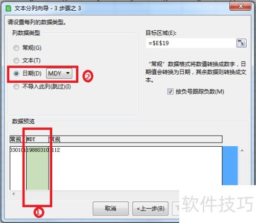 6、 分列线后的第二部分为出生年月日,选择日期MDY格式即可提取所需信息。
