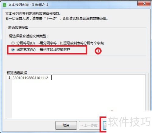 3、 在弹出窗口中选择固定宽度并设置每列字段空格对齐,随后点击下一步继续操作。