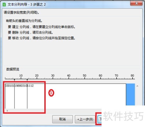 4、 根据身份证号码的排列规则,设定三条分隔线后点击下一步。