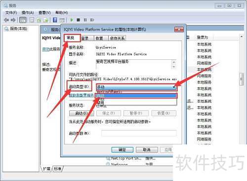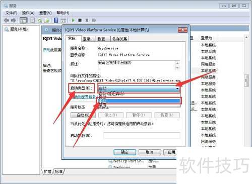 7、 若需将IQIYI视频平台服务设为手动模式,可先依次完成前五步操作。在第五步中,于下拉菜单内选择手动选项,确认后继续执行第六步,即可完成设置。整个过程操作简便,按提示逐步进行即可实现所需配置,确保服务按自定义方式运行。