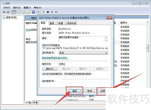 6、 此时,点击IQIYI视频平台服务项的属性(本地计算机)界面下方的应用按钮,完成设置后,再点击确定按钮即可完成操作。