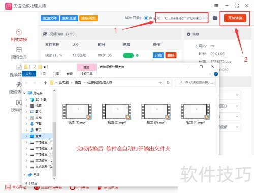 3、 第三步,首先选定用于保存转换后视频的输出文件夹,然后点击右侧红色按钮开始转换。待所有FLV视频转换为MP4格式后,软件将自动打开该文件夹,便于用户查看和管理转换完成的视频文件。