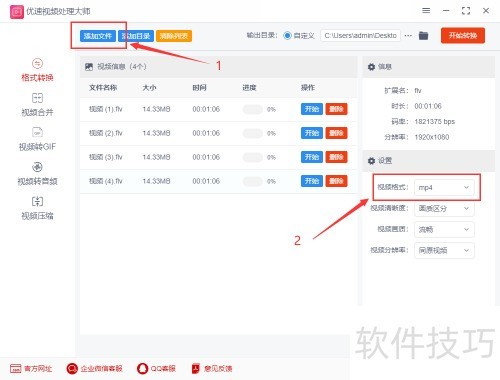 2、 第二步,点击界面左上角的按钮,导入需转换的FLV视频文件,支持批量添加以提升效率。随后在视频格式右侧的下拉菜单中选择MP4,设定输出格式。