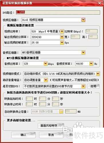 7、 进入设置待转换视频参数界面后,可灵活调整输出视频的各项参数,软件默认设置效果同样出色。此外,还提供多种实用功能,如音量增强(特别适用于音量较小的DVD,体现人性化设计)、视频裁剪、画面特效处理等,满足多样化的视频编辑需求,操作便捷,功能全面,极大提升使用体验。