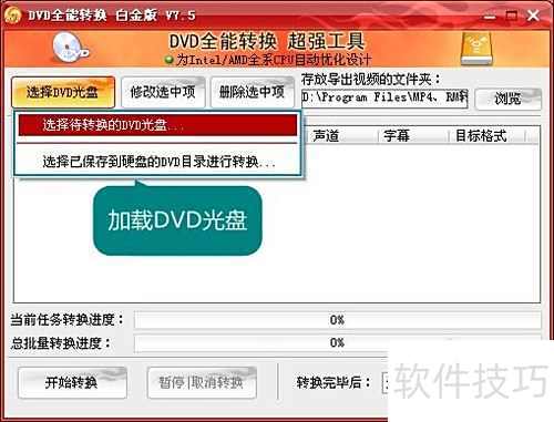 3、 打开DVD全能转换工具主界面,点击左上角选择DVD光盘按钮,在下拉菜单中可选择不同的加载方式。软件提供两种便捷途径:直接从光驱读取DVD光盘,或从硬盘导入已存储的DVD文件夹。后者不仅规避了光驱读盘速度慢、易出错的问题,还能充分发挥该软件全球领先的转换效率,显著提升处理速度。通过硬盘加载DVD内容,有效避免因光盘划伤或光驱老化导致的读取失败,使转换过程更加稳定流畅,极大提升了用户体验,是高效、可靠的优选方案。