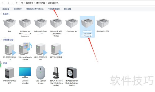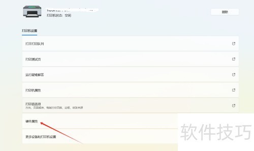 3、 选择需设置票据尺寸的打印机,点击其名称,进入打印机设置,找到硬件属性并点击进入。