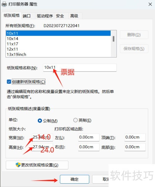 4、 在属性页面的常规选项旁点击设置,进入设备和打印机文件夹,选择目标打印机,打开其打印服务属性。在表单名称栏输入票据,随后设置所需尺寸,最后点击确定完成配置。整个过程操作简单,按步骤即可顺利设置完毕。