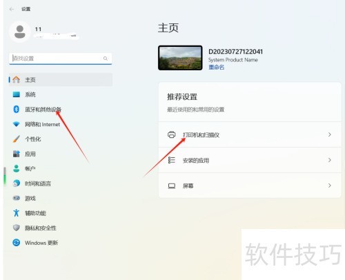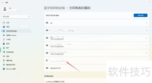 2、 在页面左侧找到蓝牙和其他设备,点击右侧打印机和扫描仪选项。