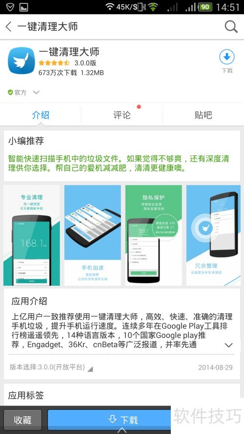 数亿用户共同推荐的一键清理大师,以高效、迅速、精准的垃圾清理功能,显著提升手机运行速度。多年来稳居Google Play工具类应用榜单前列,支持14种语言,获10个国家Google Play官方推荐。深受Engadget、36Kr、cnBeta等主流科技媒体关注与报道,并率先通过卡巴斯基安全检测,确保纯净无毒,使用更安心。