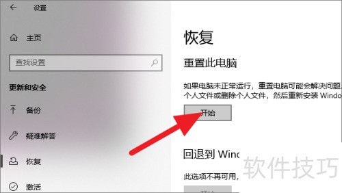 6、 点击恢复后,再点击右侧栏重置此电脑的按钮。