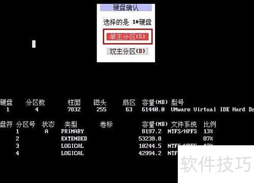 6、 进入硬盘确认界面后,通常选择单主分区(S)并按回车键确认。