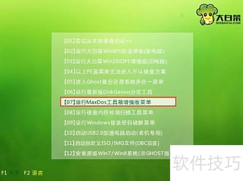 1、 将制作好的大白菜U盘插入USB接口,台式机用户建议连接机箱后置接口。重启电脑,在开机画面出现时,通过启动快捷键引导U盘启动,进入大白菜主菜单界面。使用方向键选择运行MaxDos工具箱增强版菜单,按下回车键确认执行。