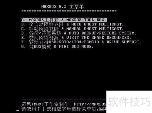 3、 进入MAXDOS主菜单后,用方向键选中A.MAXDOS工具箱&MAXDOS TOOL BOX,按下回车键确认操作。