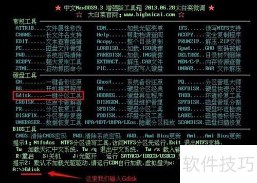 4、 在MAXDOS工具界面中,输入Gdisk并按回车,即可启动Gdisk一键分区工具。