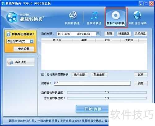 2、 超级转换秀是一款音视频格式转换工具,如需将CD转为MP3,只需选择复制CD并转换功能,即可轻松完成操作。