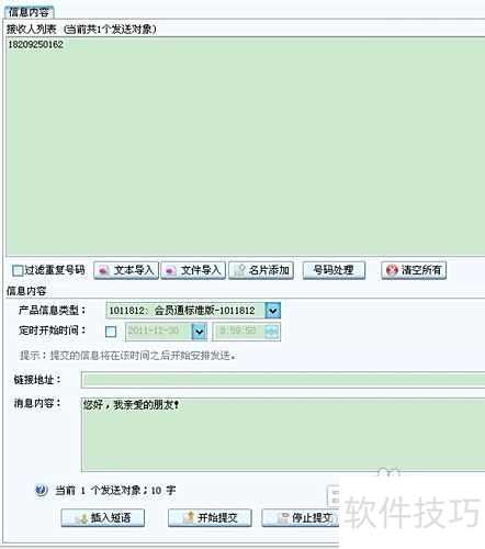 3、 点击左上角编写短信,在右侧输入目标号码,下方产品信息类型选择1011812,再于输入框内填写不超过70字的短信内容,确认无误后点击开始提交即可完成发送操作。整个过程简单快捷,确保信息准确无误。
