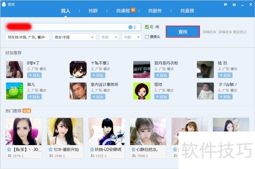 4、 进入查找页面,切换至找人选项,输入QQ号后点击查找即可。