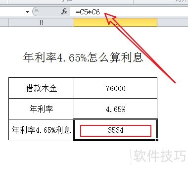 3、 输入公式计算年利率4.65%的利息金额,完成计算后即可得出结果。