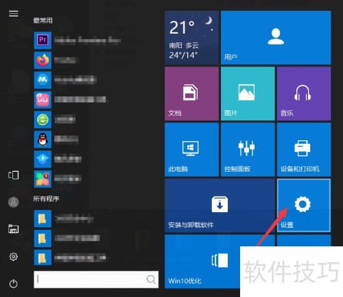 1、 先卸载软件并重启电脑,接着点击左下角开始菜单,选择右侧的设置选项进入。