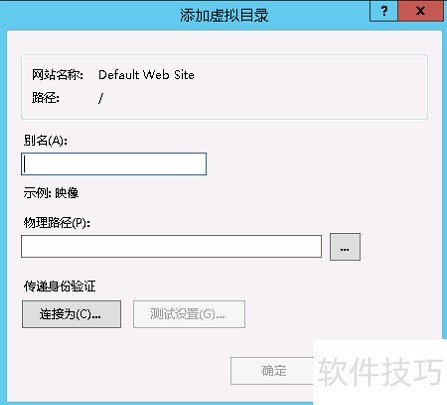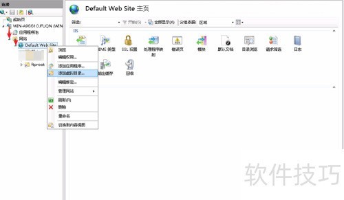 3、 右键点击默认网站,选择添加虚拟目录,设置别名为ftproot,建议使用便于记忆和联想的名称。