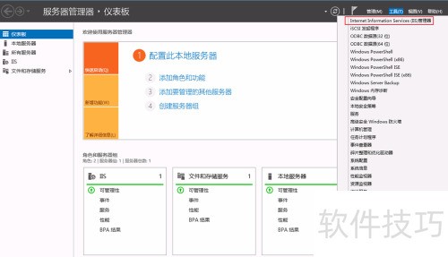 1、 首先,打开服务器管理器,选择工具菜单,然后点击其中的Internet Information Services(IIS)管理器选项。