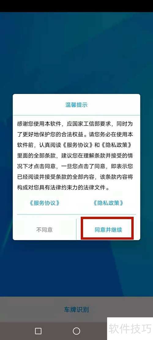 1、 开启手机上的车牌识别应用,查看协议内容后点击同意,操作见图中红框标注处。