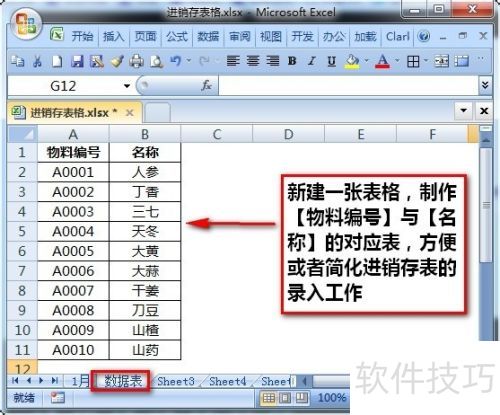 3、 新建一个名为数据表的表格,用于存放物料编号与名称信息。