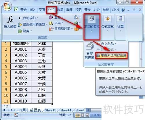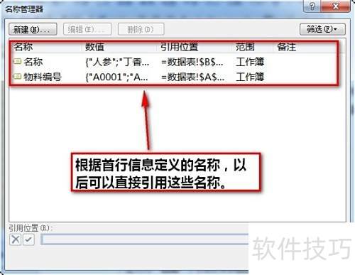 8、 将A2:A11区域命名为物料编号,B2:B11区域命名为名称,定义完成后可通过按Ctrl+F3查看已设置的名称。