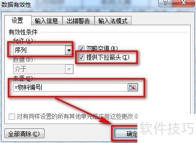 10、 在弹出窗口中,将设为序列,勾选,在来源框输入=物料编号,设置完毕后点击。